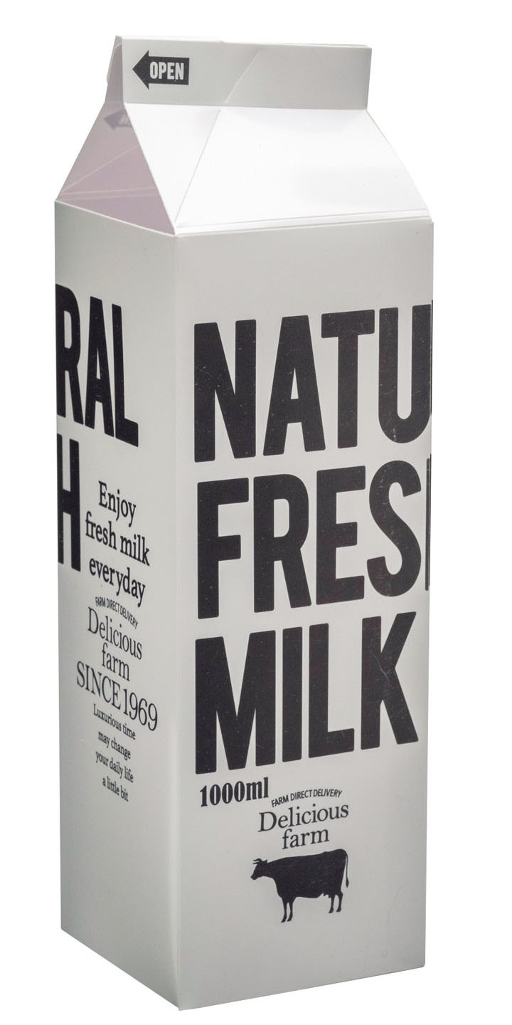 塩化ビニル樹脂製で破れにくく、市販の牛乳パックやジュースのパックなどをオシャレに保存できる。パッケージデザインは「MILK」「DRINK」の2種類あるので、セットする飲み物に合わせて選べる。