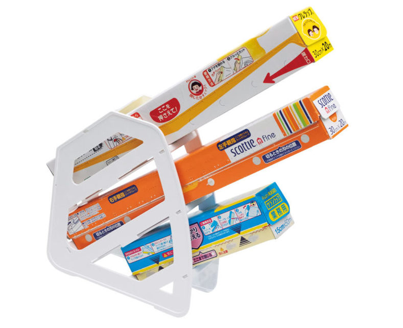 使う頻度の高いラップ類を、斜めにスライドして楽に取り出せる。3本まで収納でき、上から2段は長さ22〜30㎝の長いラップやアルミホイル、3段目は長さ15㎝の短いものに対応する。