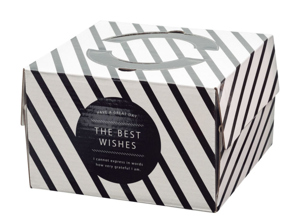 手作りケーキなどの持ち運びに役立つ、モノトーンデザインのケーキボックス。サイズ展開は4〜6号で、それぞれ柄が異なる。ケーキトレーは別売。●サイズ(5号):約W180×H115×D180㎜