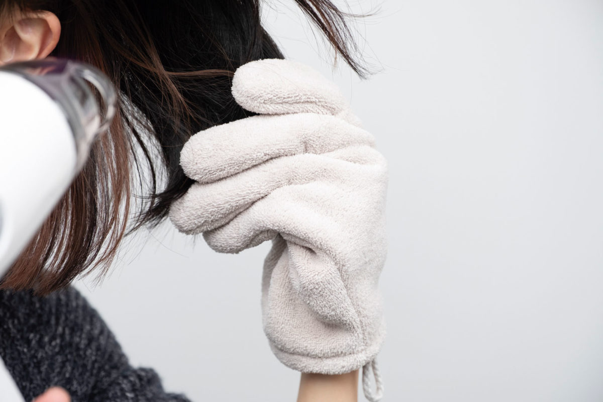 髪を乾かす際の時短アイテム。ドライヤーを持つ手とは反対の手に手袋をはめ、髪の水気を拭き取りながらドライヤーを当てる。吸水性の高いマイクロファイバーを使い、しっとり柔らかい肌触り。
