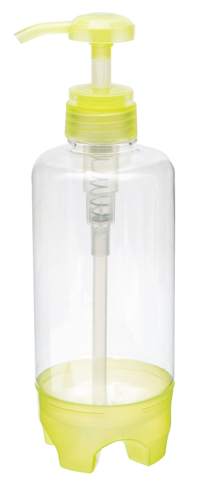 台座を外すと、底の中央に液体が溜まる形状になっていて、最後まで使い切ることが可能に。容量は280mlと500ml、カラーも各3色展開なので、食器用洗剤やシャンプーなど、様々な液体ソープを入れられる。