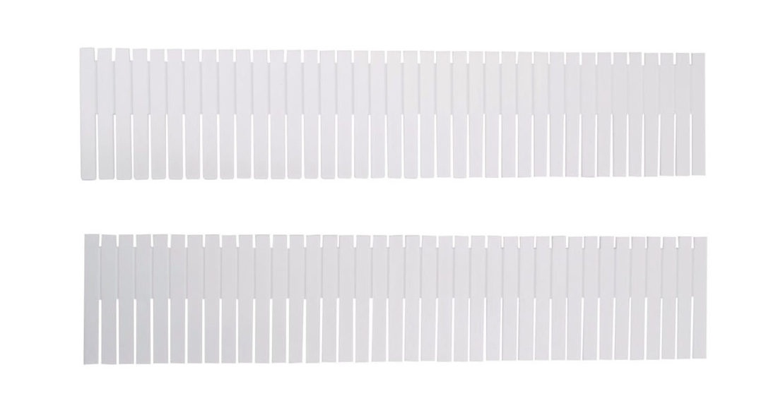 入れたいもののサイズに合わせて細かな収納スペース作りができる、ポリプロピレン製の仕切り板。引き出しや収納ケースのサイズに合わせてカットでき、凹部分を組み合わせることで自立する。2枚入。