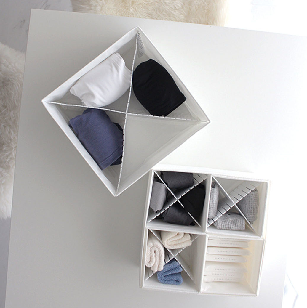 「私は収納ケースの角を使い、斜めに組んで仕切り板がズレないようにしています。白い仕切り板なので、白い収納ケースと合わせると、色が同化してスッキリ見えます」(Mariさん)