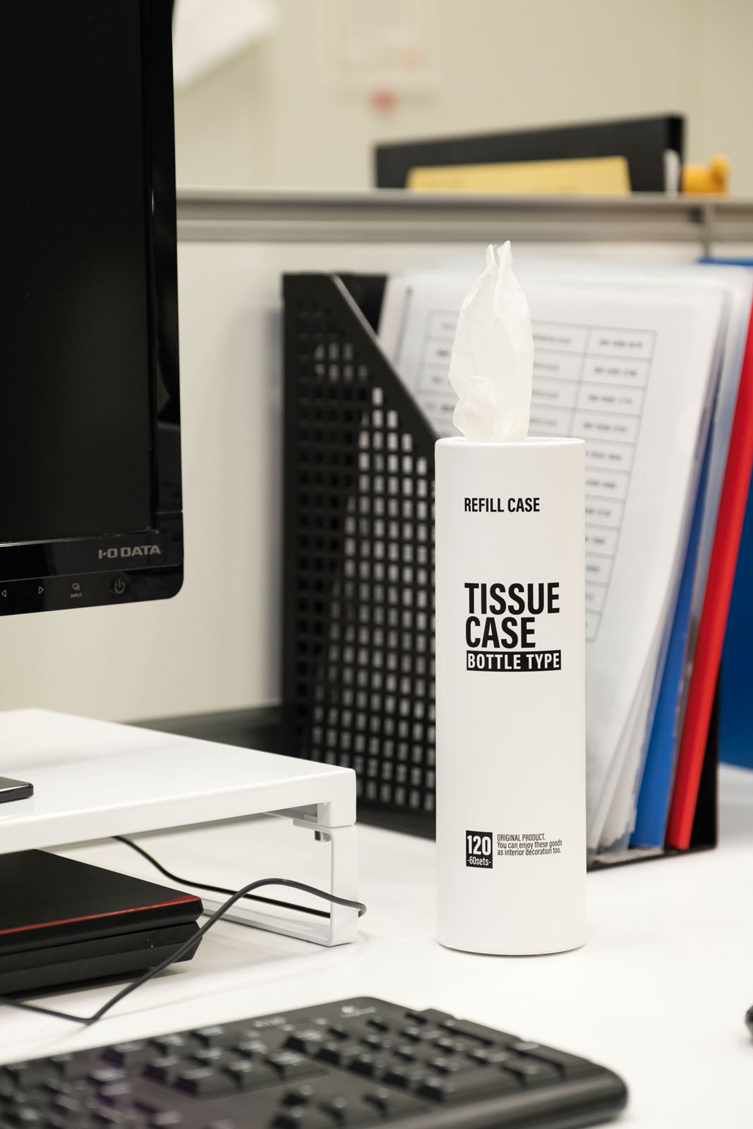 「モノが多いオフィスのデスクでもかさばらず、主張しないデザインがお気に入り。最初の1枚を引き出してから使い始めると、ティッシュがスムーズに出るようになります」(保谷)