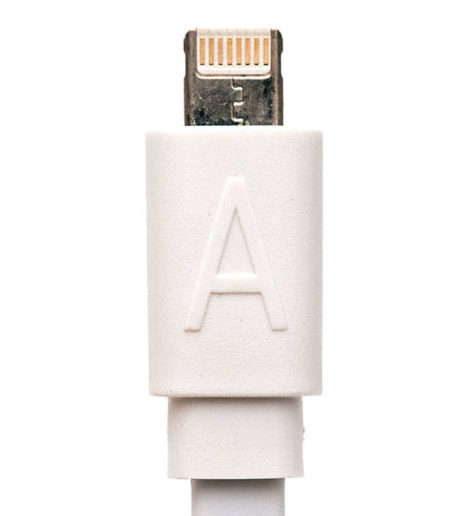 これ1本でiPhoneもAndroidも充電・通信ができる。ケーブル長は50㎝。「片面がライトニング端子、もう片面がmicro-B端子に。さりげなく『i』『A』と入っているのが親切です。意匠登録取得済みなので、本製品ならではの特徴かも」(保谷)