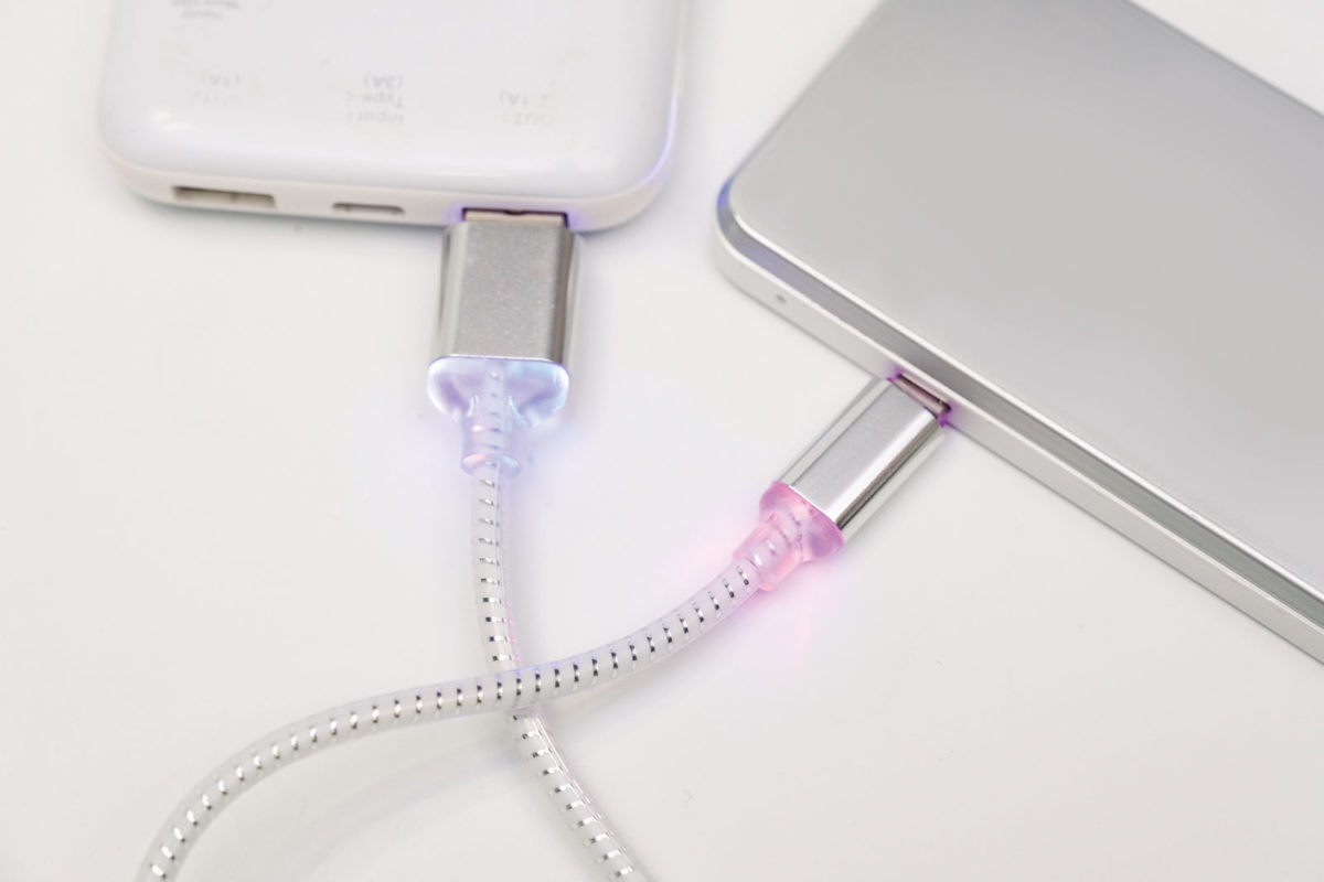 接続部分が7色に光るケーブル。充電・通信が可能で、ケーブル長は100㎝。「光っても特にメリットはないのですが、ランダムに色が切り替わり、どことなくパリピ感があるのが面白い(笑)。100円ケーブルにしては長めなのもうれしいです」(保谷)