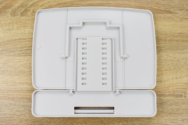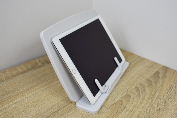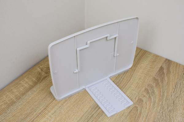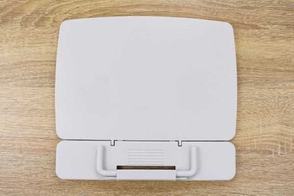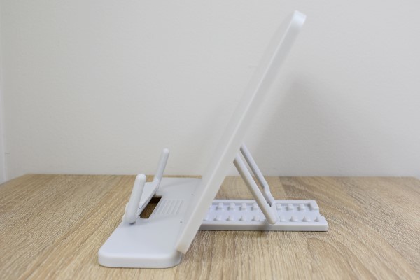 折りたたみ式で持ち運びも便利な同商品。平らな状態から約90度ほど折り曲げ、後ろのストッパーを立てかけると台として使用できます。ストッパーを留める凸凹は9か所あるので、自分好みの角度でセッティングしましょう。ストッパーを固定できれば、台の安定性はバッチリ。本体の横幅は25.5cmと大きめなので、タブレットでも難なく乗せられました。