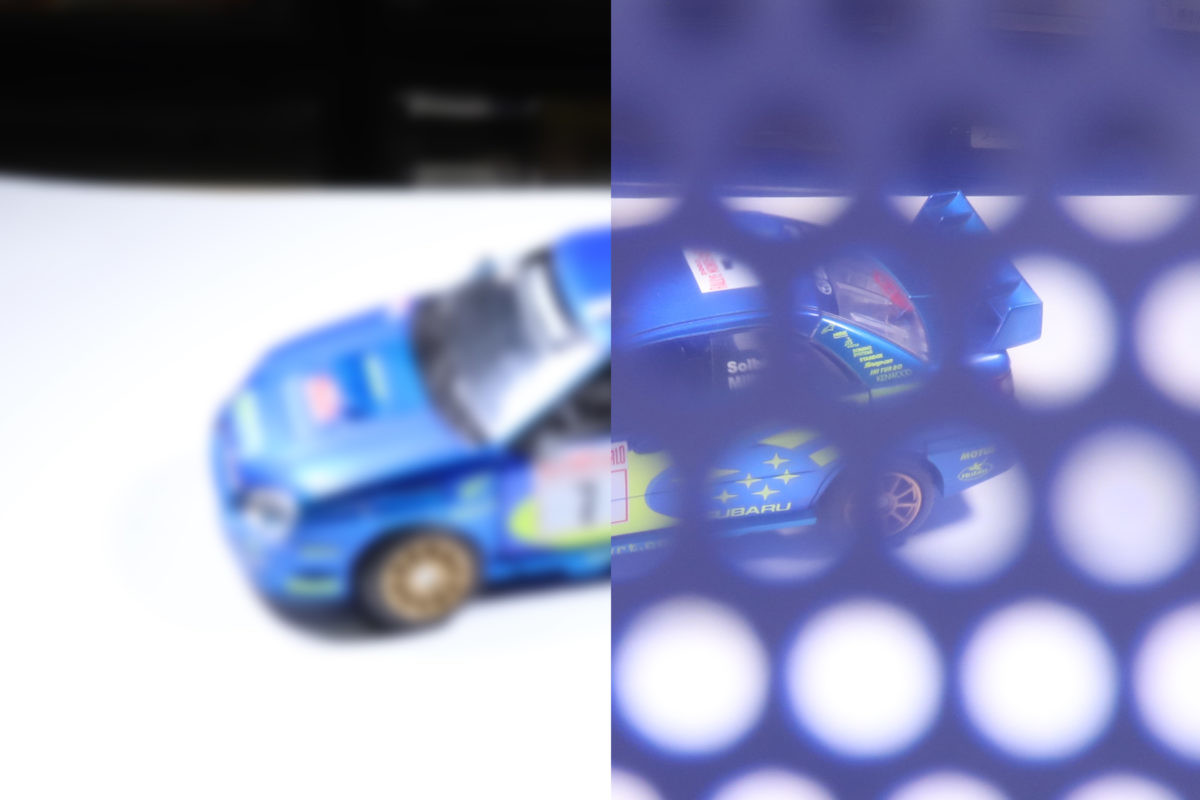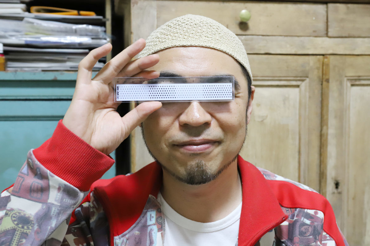 「メガミエ」は板面に細かな穴がびっしり開いており、目に当てるとピンホール効果(狭い穴を通して光が入ることで、網膜のピントが合いやすくなる)によって、近視の人でもメガネなしでよく見えるようになるのである。