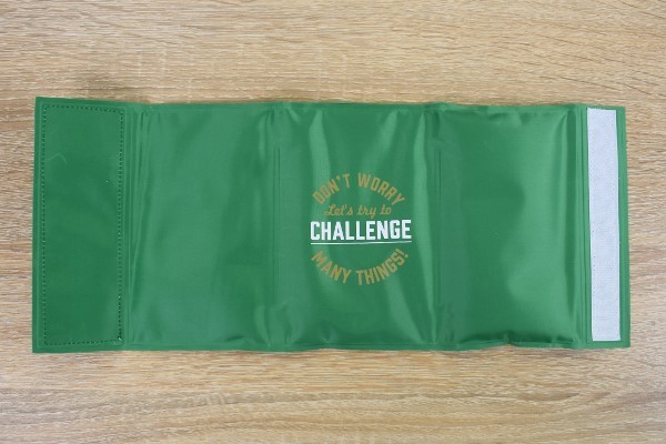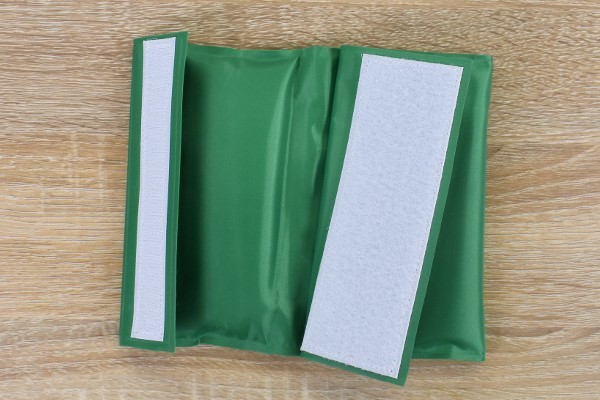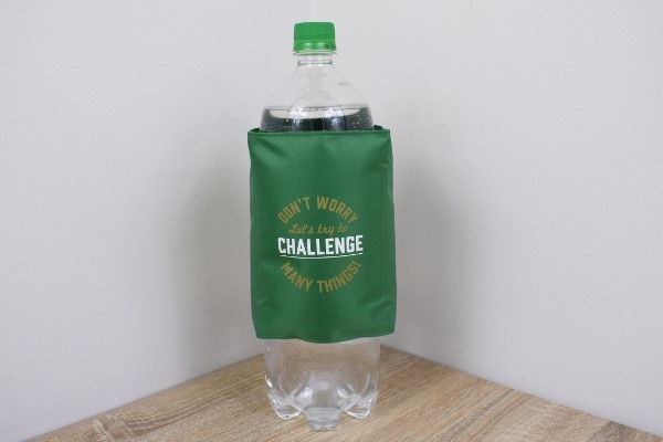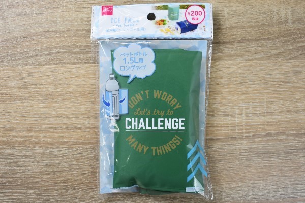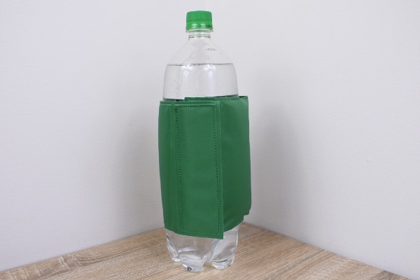 明るめなグリーンを基調とした同商品。縦幅が約15㎝、横幅は38.5㎝ほどで、1.5リットルのペットボトルを包むのに丁度いいサイズです。使い方はとっても簡単で、「保冷剤」を2時間以上冷凍庫で冷やしてからペットボトルに巻くだけ。