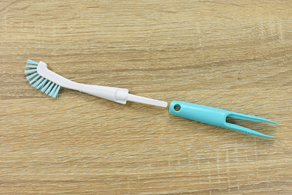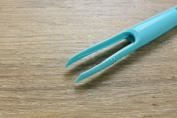 先が二股に分かれた柄の部分は、ピンセットとして使えます。両先に細かいデコボコがついているため、つかんだものをガッチリとホールド。持ち手に滑り止めがあるので、パッキンなどを引っ張り出す時に便利です。さらにピンセットはブラシから取り外せるのもポイント。ピンセットの柄が短くなり、手の小さい子どもでも扱いやすくなりますよ。