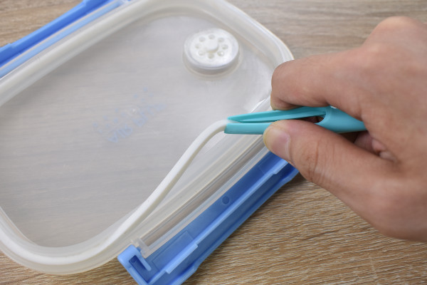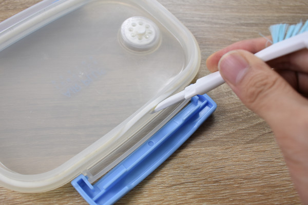 またピンセットを取り外すと、ブラシの逆サイドがピックになっていることに気づきます。ピックは水筒や弁当箱についているパッキンを外す時に大活躍。パッキンの隙間に差し込んで、ピックの先端で持ち上げるように力を入れると簡単に取り外せました。パッキンの場所によって、ピンセットとピックを使い分けるといいかもしれません。