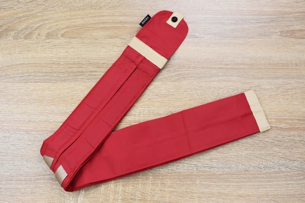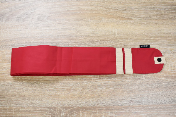 一見バッグとは到底思えないデザインで、大きさは手のひらに乗ってしまうほどコンパクト。本体の赤い生地がポリエステル製となっており、一般の傘とよく似た触り心地です。