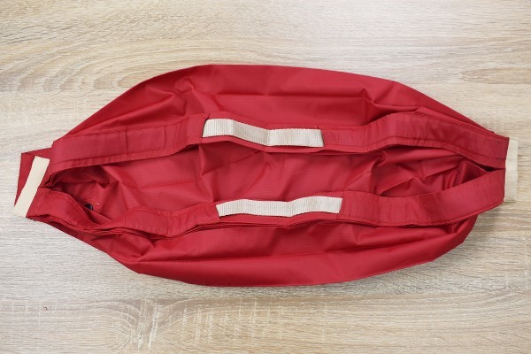 ボタンを外して口を広げると、細長いシルエットからカバンらしい姿に早変わり。真ん中にあるベージュ色の部分を2か所引っ張れば、ポリプロピレン製の持ち手が出てきます。大きさは約32cm(縦)×30cm(横)ほどで、5kgまで物が入れられます。