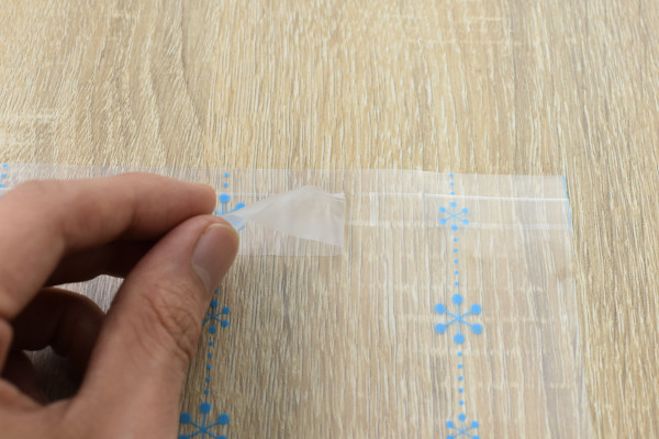透明のフィルムにプリントされているのは、氷をイメージした絵柄。見た目からでも涼しげな雰囲気が伝わってきます。フィルムは2枚封入されており、大きさは約60cm×50cmほど。冷蔵庫への貼りつけができるように、フィルムの片側には粘着テープの“はくりフィルム”がついていました。