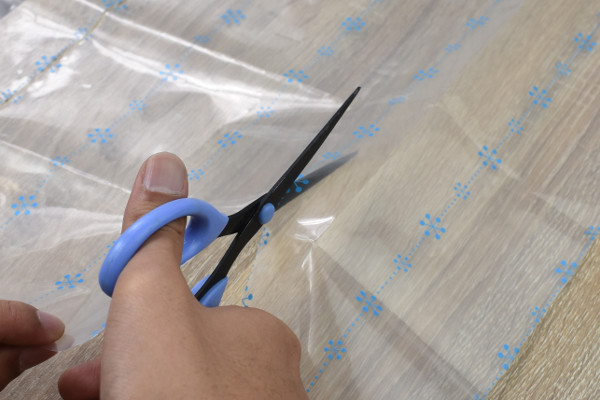 使い方は、まず冷蔵庫の大きさに合わせてフィルムを“のれん状”にカット。柄に沿って切ることで、きれいなのれんの形にカットできます。冷蔵庫内をきれいに拭いたら、あとは“はくりフィルム”をはがして同商品を貼りつけるだけ。