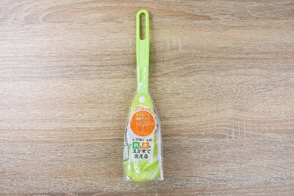 グリーンカラーのボディは柄とスポンジが細長く、深さ20cmまで洗えます。またスポンジの先端が“90度に曲がった三角形”になっているのもポイント。触り心地は柔らかいため、これならボトルを傷つけずきれいに底が洗えそう。