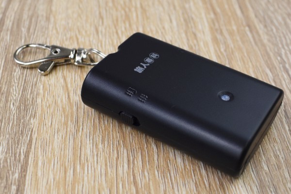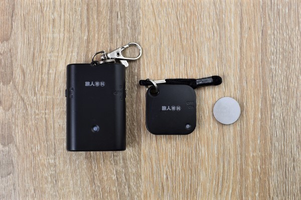 同アラームは“親機”と“子機”の2つに分かれていて、互いの電波が途切れたら音が鳴る仕組み。まずは親機を確認すると、本体両側にスライド式の小さいスイッチがついていました。右のスイッチは“アラーム距離の切り替え”、左で“アラームのパターン”を設定できる模様。