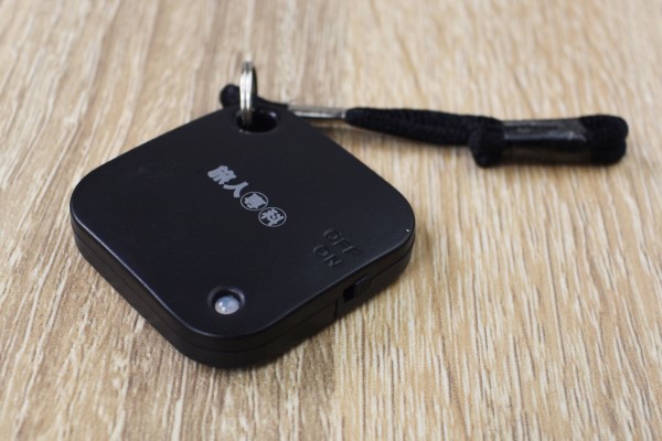 子機には親機のようなスイッチはなく、ついているのはLEDライトとストラップの紐のみ。とてもコンパクトで軽いため、私物につけても邪魔にはならなそうです。それではカバンに子機を取りつけて、少し離れてみましょう。