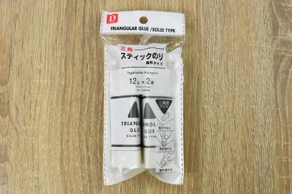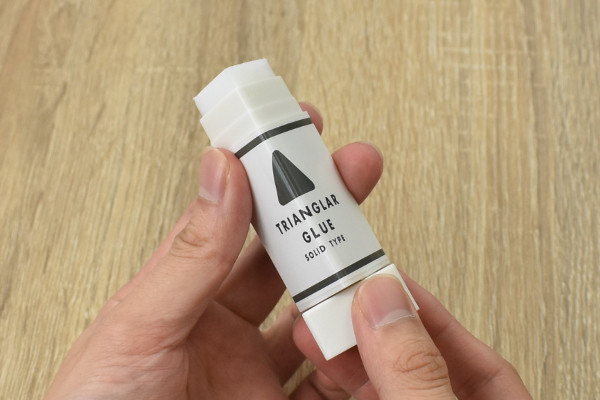 今回ご紹介するのは、ダイソーで購入した「三角スティックのり固形タイプ」。普通のスティックのりとは違い、スティックの形状が三角柱になっています。形を変えただけかと思いきや、のりとしての使い心地は格段にアップ。実際に使用して性能を確かめてみましょう。