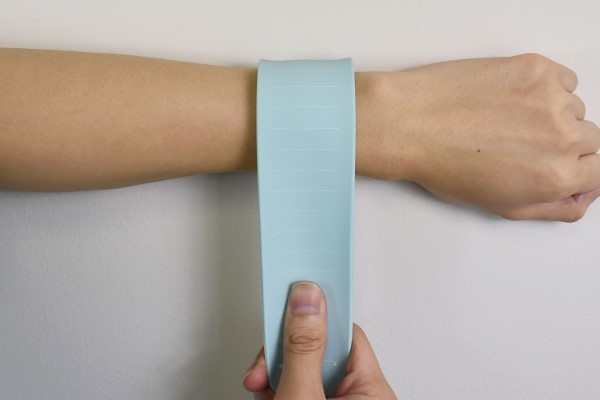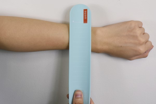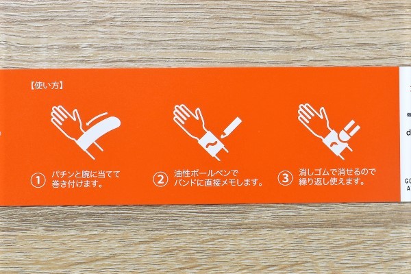 装着方法はとってもシンプルで、本体をパチンと腕に当てて巻きつけるだけです。メモする際は油性ボールペンを使いますが、なんと書いた文字が消しゴムで消せるんです。それでは早速使ってみましょう。