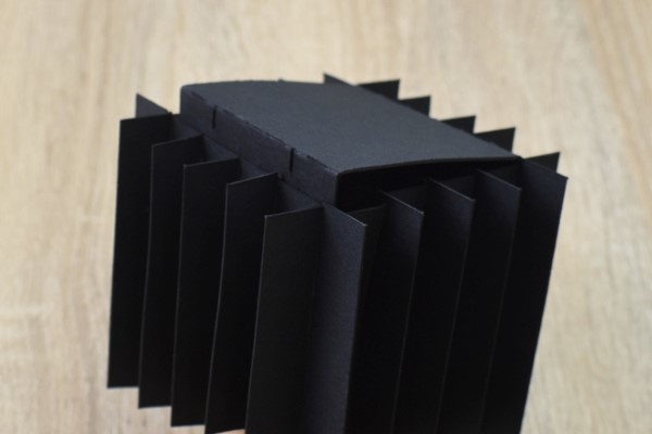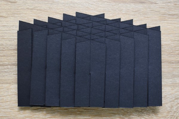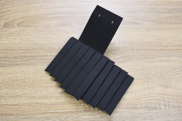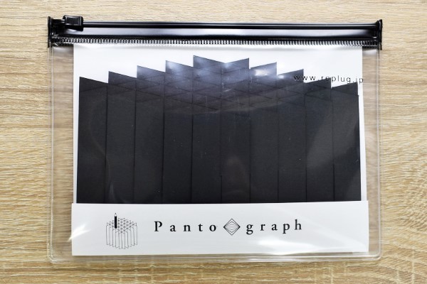 ファスナーつきのポーチから、真っ黒なパンタグラフがお目見え。紙がいくつも重なっており、表面は画用紙と似たザラザラの触り心地でした。ペンスタンドとは思えない見た目ですが、一体どのように姿を変えていくのでしょうか?