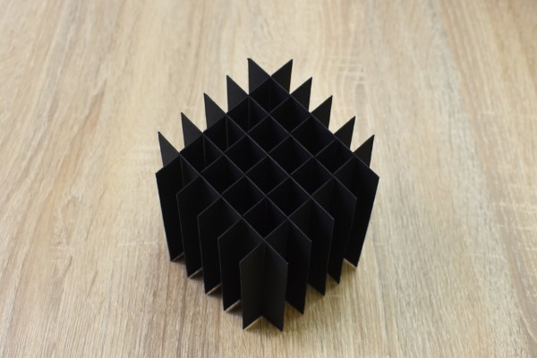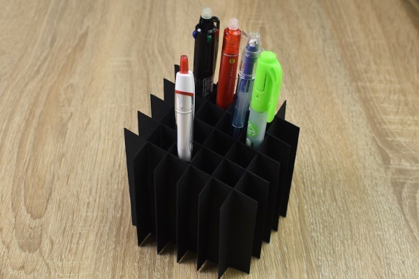 できあがったペンスタンドは、とても幾何学的なデザインです。紙を組み合わせているだけなのに、まるで芸術品のよう。試しに使ってみると、碁盤の目状になったスタンドにペンが1本ずつ挿さりました。おかげでペン同士が交差することはなく、取りやすさもバツグン。ビシッと整頓された印象になるため、デスクの整理がより捗るかも。