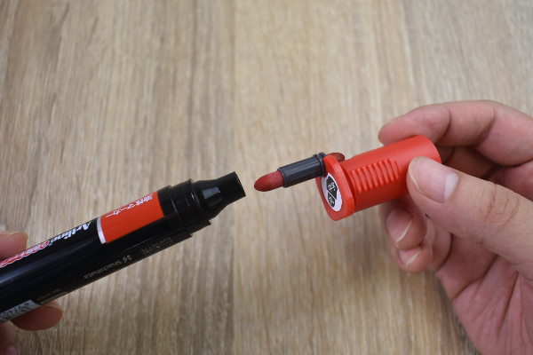 2つ目は、“人に優しいアルコール系インキ”の採用。油性マーカー独特の臭いをセーブしており、使用時の不快感が少ない仕様に。そして3つ目のポイントが、インキ補充とペン芯の交換が簡単なこと。“フック&プルシステム”によって、誰でも簡単にペン芯を交換できちゃいます。キャップをよく見てみると、先端に“レンチのヘッド”みたいなU型の爪を確認。ペン芯のくびれに爪を引っ掛けたところ、キャップが見事にジャストフィットしました。後は引っ張るだけで、スムーズにペン芯の交換が可能。
