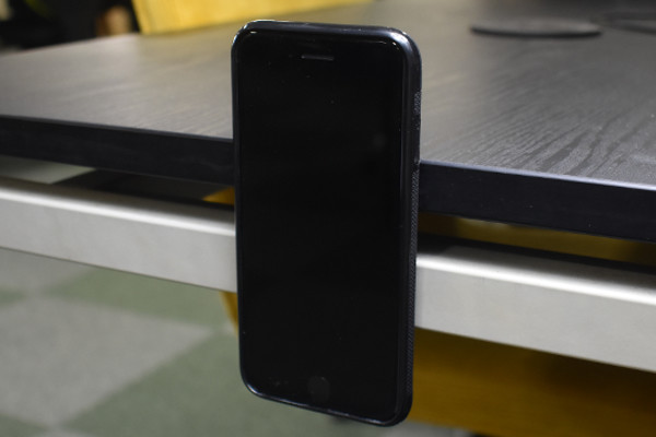 それでは試しにくっつけてみましょう。平らな壁にケースを押しつけると、見事にスマートフォンが貼りつきました。しっかり密着するので、床に落ちてしまう心配もなさそう。なんと机の側面にも貼りつけることができ、安定感もバツグン。これなら手に持って撮影する必要がないため、自撮りの幅が広がるかも。
