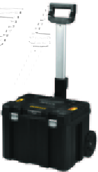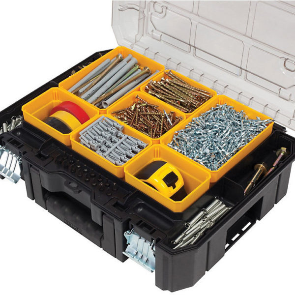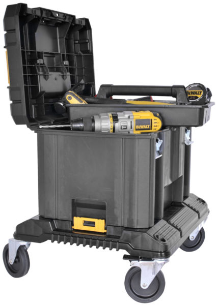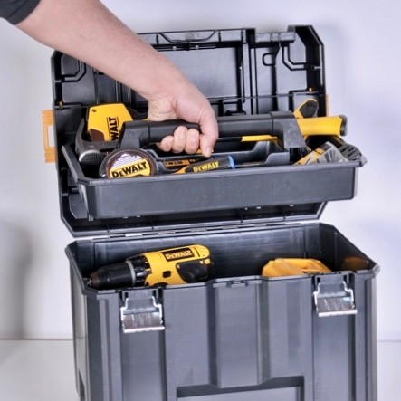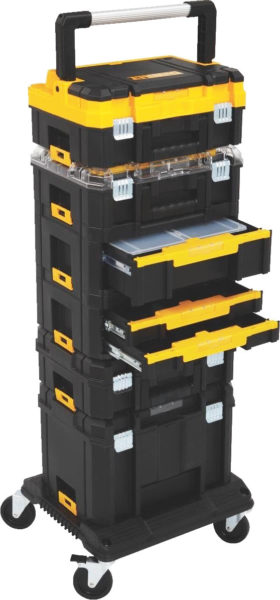 今回出たのは全11種類。電動工具類の収納に便利な大型ボックスから、ネジやビット類などの収納に便利なチェストや小型ボックス、持ち運びやすいロングハンドル付きボックス、キャリー付きボックス、キャリーカート、キャリーユニットなど11種類。これらを連結・スタックすることで、高い汎用性と機動性を発揮します。また、現在国内で展開するDEWALTの充電式電動工具シリーズのキットボックスとも連結可能な設計。