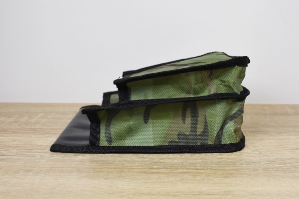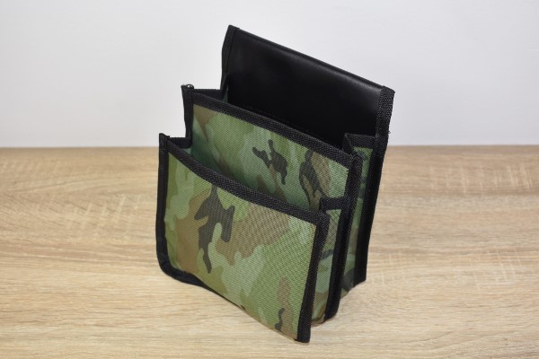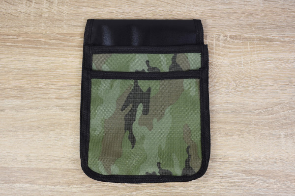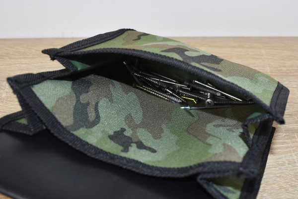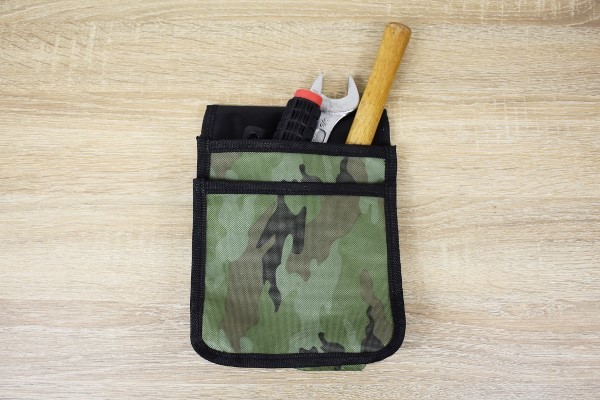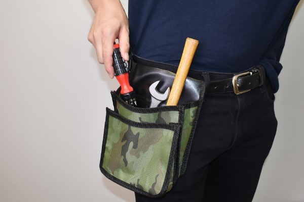 同商品は約21.5(高さ)×16.5(幅)×8.5cm(厚み)と、作業する時に邪魔にならないコンパクトなサイズ感。袋のデザインは緑を基調とした迷彩柄で、ジーパンのベルトに装着すればスタイリッシュに使えそうです。また通す穴も6.5cmほどの幅があるため、一般的なベルトなら問題なく取りつけられますよ。