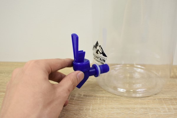 それではポリ容器に水を入れて、ジャグとしての性能をお試し。まずはコックを下側に“グッ”と押してみたところ、中に入った水が“ちょろちょろ”っと出てきました。水の勢いが強くないので、注ぐ時に水量のコントロールが簡単そうです。ちなみにコックは押し上げても水が出るため、使い方がわかりやすいのもうれしいところ。