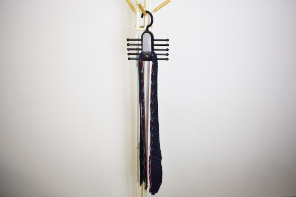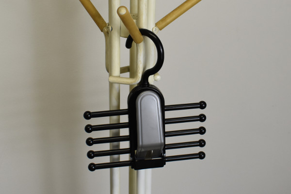 続いてネクタイ用のフックをお試し。まずはたたまれているフックを、「カチッ」と音がするまで倒します。フックにネクタイをかけてみたところ、そのかけやすさに驚き。フックが大きいため、余裕をもってネクタイがかけられますよ。ちなみにネクタイは30本もかけられる模様。