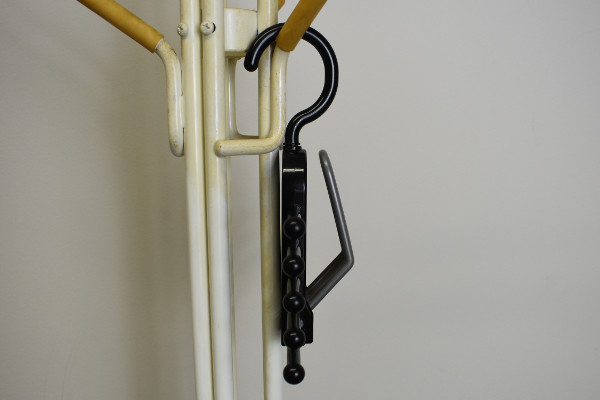 同商品は10本のベルト用アームと、ネクタイ用のフックがついている変わった形のハンガー。まずはアームに、革のベルトをかけてみましょう。するとアームとアームの間にバックルが引っかかり、しっかりとベルトを固定。計8本ものベルトがかけられるのはうれしいポイントですね。