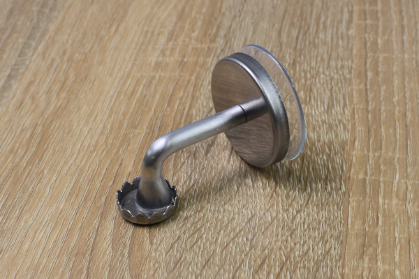 水道の蛇口に近い形をした同商品は、ステンレススチールやアルミニウムなどで作られた光沢のあるデザイン。サイズは約50(幅)×65mm(奥行)と小さく、手のひらに納まるくらいの大きさです。また本体を壁に貼りつけられるよう、ボディの裏側には透明な吸盤が。