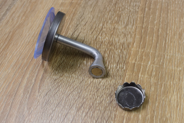 いちばん目を引くのは、本体の先端にある小さい金具。ビール瓶の王冠とそっくりな見た目をしており、表面がツルツルで裏面はギザギザしています。どうやら本体に磁石がついているようで、少し強く引っ張ると取り外すことができました。