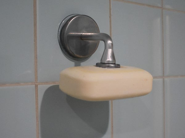 タイルの壁に設置すると、吸盤がピタッと貼りついて安定感はなかなか。セットした石鹸を触っても、しっかりバランスをキープしてくれました。これなら吸盤がくっつく場所であれば、どこでも石鹸置きが設置できそう。ちなみに石鹸の重みで安定しない場合は、石鹸が上に向くようにセットすることで落下を防止できますよ。