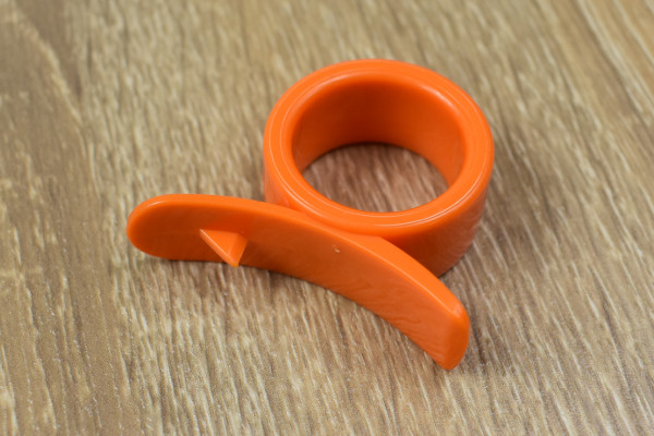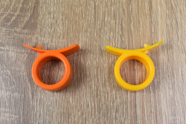 皮むき器は黄色とオレンジの2色入りで、どちらも効果や使い方に違いはありません。指輪のような輪っかに曲線形のパーツがついており、極小の刃がついているのが特徴的。