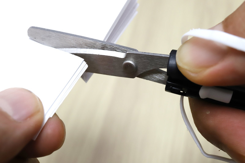 カーブ刃とハンドルが相まって、コピー用紙を重ねたり、厚紙をザクッと切ったりするような作業にはなかなかの切れ味を発揮する。実際、コピー用紙を20枚まとめて切れるペン型ハサミは相当にレアだ。いや、そもそも携帯するハサミでそこまで切る機会はあまりないだろうが。