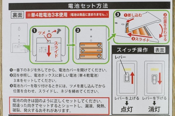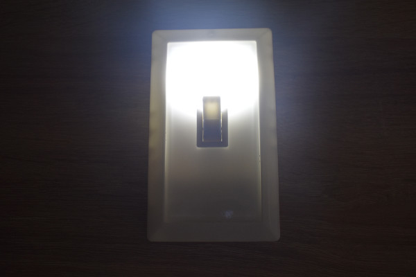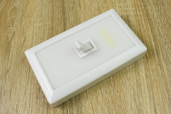 続いて、実際にライトを点灯させてみることに。まずは裏側の電池ボックスに単4乾電池3本を挿入し、しっかりとフタをネジで止めます。表面のスイッチを「カチッ」と入れてみたところ、表面が驚くほど真っ白く点灯。COB(Chip On Board)が使用されているため、光量はかなり明るめです。暗い部屋で使ってみましたが、部屋全体がぼんやりと照らせるほど。しかし目に光が当たってしまうとかなりまぶしいので、使用の際は注意が必要かもしれません。