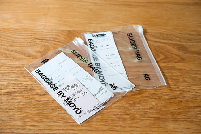「残したいレシートは、それぞれラベリングして入れておきます。また、家計簿にジッパー付き保存袋をテープで留め、“食費”“交際費”などとラベリングして、予算立てしたお金を入れておくと、使いすぎず家計のやりくりに役立ちます」