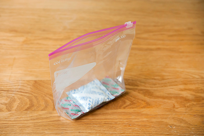 海苔や乾物に入っている大きめのシリカゲル(乾燥剤)をジッパー付き保存袋に入れておけば、除湿アイテムに早変わりします。