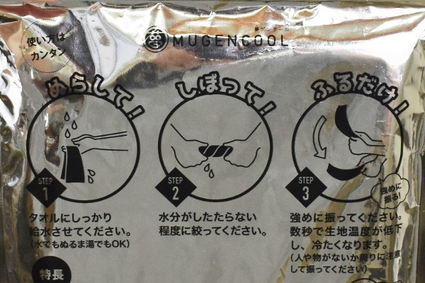 同商品は水で濡らした後、タオルを絞って振るだけで使えるようになります。冷たい水でなくても効果が期待できるのはうれしいポイント。どうやら発生させた気化熱で生地温度を下げ、冷感効果をアップさせているようです。