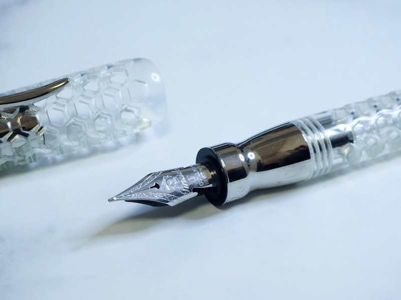 この万年筆のすごいところは、「ハニカム」と「透明(スケルトン)」という難しいふたつの要素を両立させている点にあります。ハニカム構造が難しいことは言うまでもありませんが、実はスケルトンも簡単ではありません。美しい透明軸を作るには、濁りのない高品質のレジンを使用したり、接着剤を用いないなど、様々な工夫が必要です。