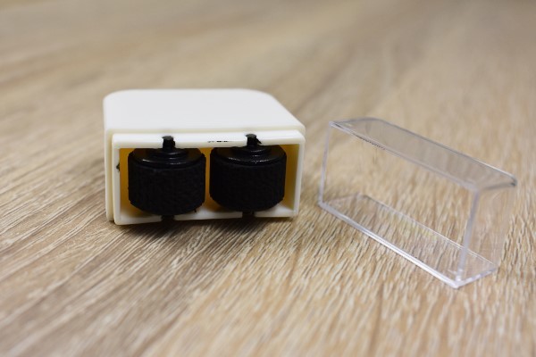 同商品は手のひらに乗るほどの大きさで、ズボンのポケットにも入るサイズです。スタンプはローラータイプとなっており、2つのローラーがついていました。
