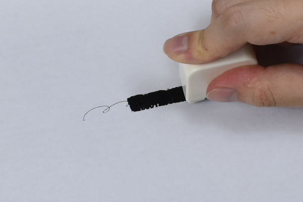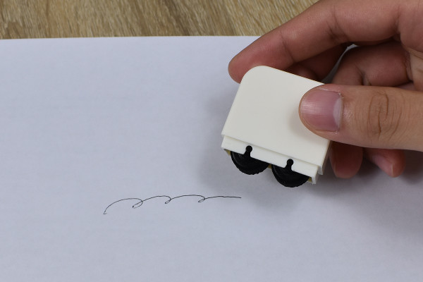 それでは実際にスタンプの効果を実証。ボールペンで試し書きした部分に、スタンプをコロコロと転がしてみます。するとランダムに並べられた数字が、1本の線状に羅列。あっという間に試し書きした部分が隠れました。しかもローラーは2つついているため、もちろん数字も2重。スタンプの下に何が書いてあるのか、もう分かりません。