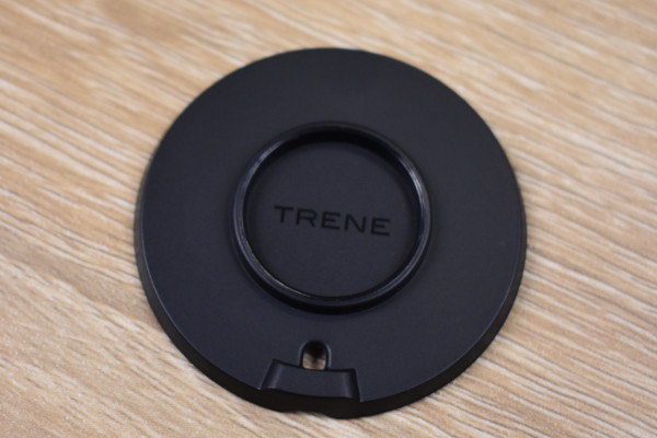 富士山のような形をした同商品は、黒色で高級感のあるデザイン。外形寸法は約40(直径)×29mm(高さ)、質量は18gほど。手のひらにちょこんと収まるコンパクトなサイズで、ほとんど重さを感じません。トレネ本体以外に、アタッチメント、アタッチメント用両面テープ、ストラップが付属していました。