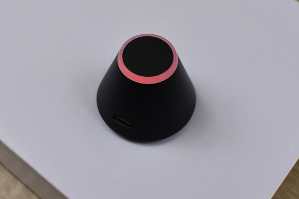使い方は見張ってほしい荷物の上にトレネを置いて、専用アプリ「TRENE」で現状を確認するだけ。まず最初にトレネ本体を見ていきます。本体は動きを感知すると、てっぺんのLEDライトが点灯してアラームが鳴る仕組み。どうやら、緑色(スタンバイ)・オレンジ色(見守り)・赤色(アラーム)といった風に点灯するよう。充電する際は底面にある主電源スイッチを目印がある方向へスライドして、USBケーブルを繋いでください。おおよそ2時間でフル充電され、連続使用時間は20時間程度です。