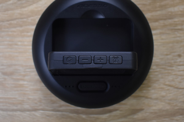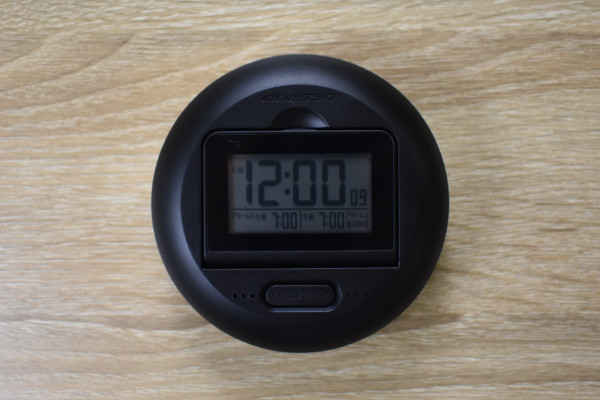 液晶画面は、くぼみに指を引っかければ起こすことができます。起こした画面の天面には4つのボタンが並んでおり、このボタンで現在時間やアラーム時間を設定可能。また画面の傍にある“スヌーズ/ライトボタン”を押せば、画面が点灯する仕組みに。
