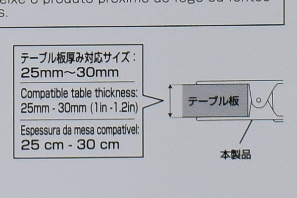 本体にはバネがついており、クリップ部を開くとテーブルへ挟める仕組みになっています。板の厚みが25~30mmのテーブルに対応しており、耐荷重量は800gほど。挟む力が結構強いので、クリップ部に手を挟まないよう注意してください。