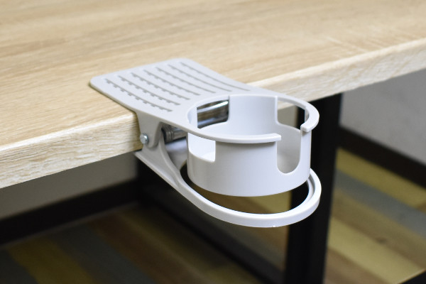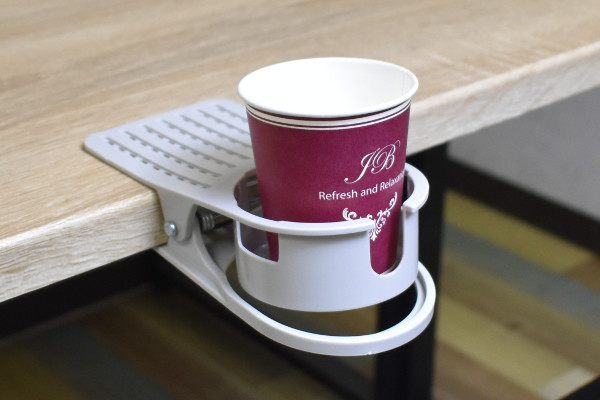 それでは、早速使ってみましょう。テーブルに挟むと驚くほどがっちり固定され、軽く触ってもほとんど動きません。試しに紙コップやジュース缶を置いてみた結果、安定感はなかなかで使い心地もGOOD。またドリンク容器以外にも使えるのが同商品のポイントです。例えばオフィスデスクの端に挟めば、小物入れとして利用可能。上手く使えば、様々なシーンで大活躍するかも?